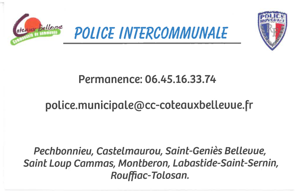 POLICE INTERCOMMUNALE : UNE PREMIERE EN MIDI-PYRENEES   La communauté de communes des Coteaux Bellevue a entamé en début d’année 2006  une étude sur la création d’un service de police intercommunale. Suite à diverses réunions d’orientation, et grâce à l’aide juridique de l’Agence Technique Départementale, les élus communautaires ont décidé de procéder à un transfert des policiers municipaux à la CCCB. Il s’agit de la première police intercommunale en Midi-Pyrénées. Depuis le 1er février 2007, les habitants de la Communauté de communes bénéficient donc d’un service de police intercommunale. Les Maires des sept communes de la CCCB ont eu la volonté de regrouper leurs forces et leurs moyens afin d’assurer une meilleure protection des biens et des personnes sur le territoire intercommunal. En lien avec les gendarmeries de L’Union, St-Alban et Launaguet, la police intercommunale est chargée de la prévention, de la surveillance du territoire, de jour comme de nuit, et notamment pendant les vacances scolaires, de la police de la route et du bon déroulement des manifestations organisées sur les communes. Parallèlement, les policiers sont également mis à disposition des communes en fonction de leurs besoins et placés sous l’autorité du Maire de la commune où ils sont affectés. Le service compte neuf agents à votre service :   - 6 agents de police municipale  - 2 agents de surveillance des voies publiques   - 1 agent administratif   Les horaires :   du lundi au vendredi  8h30 / 12h00  14h00 / 17h30  1 équipe de 14h00 à 19h00 avec des sorties de nuit.  Numéro d’appel de la police Intercommunale : 06.45.16.33.74 en semaine aux heures ci-dessus